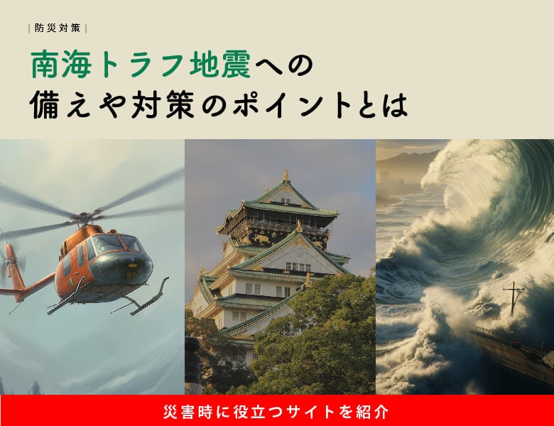 更新日:2024.08.28スタッフブログ日本列島は地震大国として知られており、南海トラフ地震はそのなかでもとくに高いリスクをもつ地震の一つです。南海トラフは、紀淡海峡を挟んで四国と本州の南方沖に位置し、地震活動が盛んな海溝です。万が一、南海トラフ断層帯沿いに大規模な地震が発生すると、それに伴う津波が日本全国に及ぶ恐れがあるといわれています。しかし、適切な備えと対策により、減災することは可能です。今回は、南海トラフ地震によって想定される被害と地震発生時の安全対策、今からできる地震の備えなどをご紹介します。